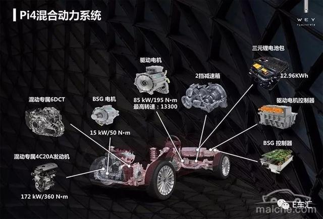 为什么说它是buff呢?原因就在它的布局上,它是直接布局在后驱动轴上的电动机,工作模式相对独立,可以在任何工况下进行驱动或者发电,配合发动机车辆也就形成了四驱模式。当然,缺点就是它并不和发动机有实质的机械连接,因此无法有效率的进行“回血”,因此一般会搭配其他架构的混动一起使用。比如WEY P8使用的就是P0+P4的结构,P0在兼顾起步平顺性及效率的同时,更多的担任充电器的角色。