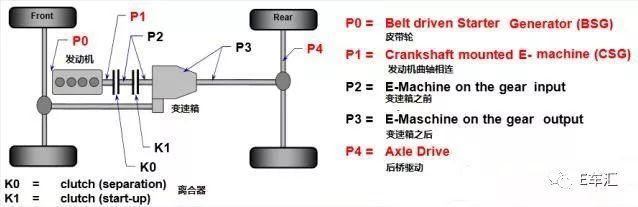 P4 电机置于变速箱之后,与发动机的输出轴分离,一般是驱动无动力的轮子。然后就是吉利的所谓P2.5的说法,是指电机位于变速箱上。