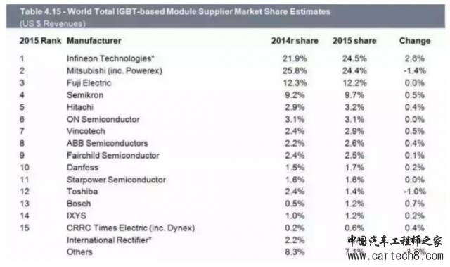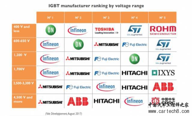 除了日系厂家,英飞凌包揽了几乎所有电动车的IGBT,而三菱电机则沉醉于中国高铁的丰厚利润中无法自拔,在低于2500V市场几乎一无所获。