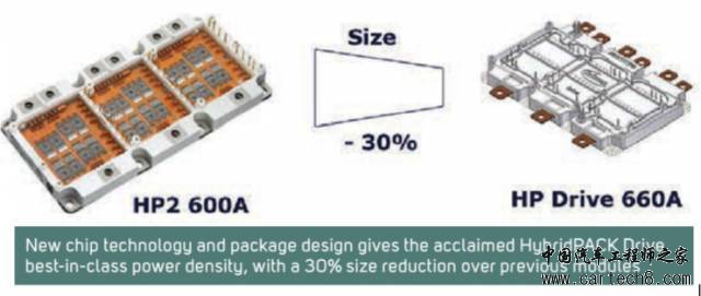 采用英飞凌的新型HybridPACK 2模块设计,每个模块内含6个单管型IGBT,750V/660A,电流超大,只需要两个模块即可,体积大大缩小。