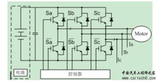 上图主要是通过脉冲宽度调制(PWM)的方式控制IGBT开关,将电流从DC转换到AC(电池到电机,驱动电机)或者从AC转化到DC(电机到电池,刹车、下坡时能量回收)。