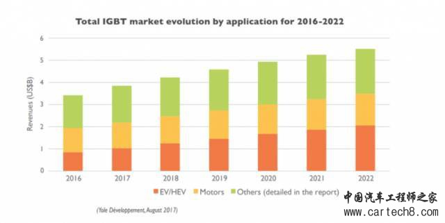 2016年全球电动车销量大约200万辆,共消耗了大约9亿美元的IGBT管,平均每辆车大约450美元,是电动车里除电池外最昂贵的部件。