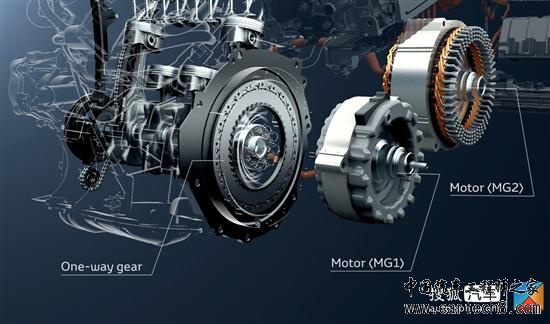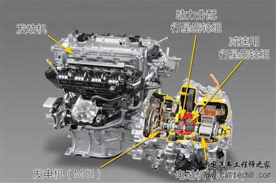 系统中带有两台电动机——MG1和MG2。MG1主要用于发电,以及作为启动电机使用。而MG2主要用于驱动汽车。MG1、MG2以及发动机输出轴被连接到一套行星齿轮机构的太阳轮、齿圈和行星架上。动力分配就是通过功率控制单元控制MG1和MG2电机,通过行星齿轮机械机构进行分配的。
