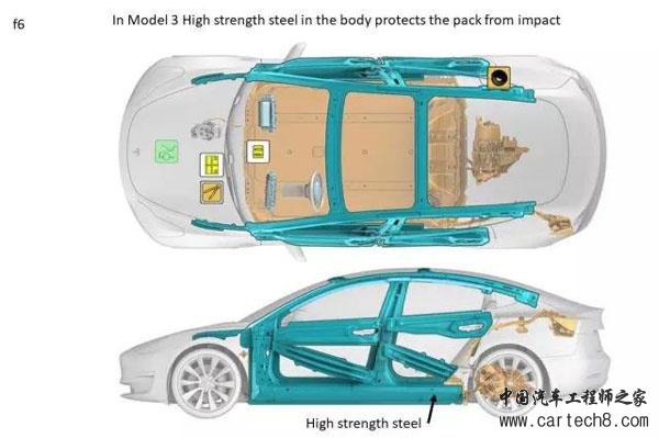 但是在 Model 3 上,高强度钢的使用率大大提高。而且最主要的地方还是分布在车身以及安置电池的部分。