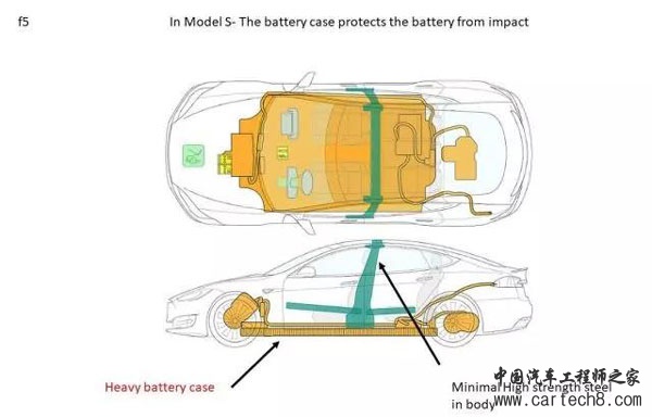 在 Model S 上,高刚度的钢在车身上使用的很少,因为有「厚重」的电池壳为电池组提供安全保护。