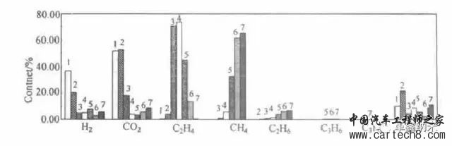 当电池电解液采用1mol/L LiPF6-EC~DMC~EMC(三者体积比1:1:1)化成电压小于2.5V下,产生的气体主要为H2和CO2等;化成电压为2.5V时,电解液中的EC开始分解,电压3.0~3.5V的范围内,由于EC的还原分解,产生的气体主要为C2H4;而当电压大于3.0V时,由于电解液中DMC和EMC的分解,除了产生C2H4气外,CH4,C2H6等烷烃类气体也开始出现;电压高于3.8V后,DMC和EMC的还原分解成为主反应.此外,当化成电压处3.0~3.5V之间,化成过程中产生的气体量最大;电压大于3.5V后,由于电池负极表面的SEI层已基本形成,因此,电解液溶剂的还原分解反应受抑制,产生的气体的数量也随之迅速下降.
