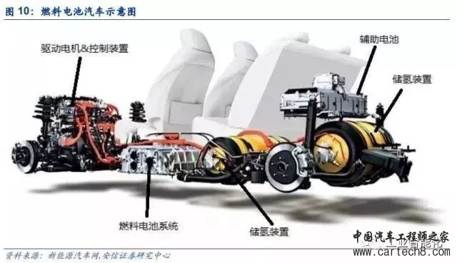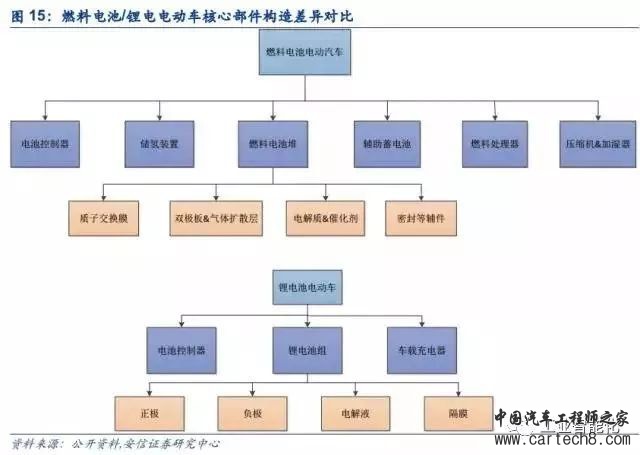 燃料电池车与锂电池最大不同在于驱动力来源,燃料电池车动力来源包含电池控制器、储氢装臵、电池堆、辅助蓄电池、燃料处理器、压缩机和加湿器,而锂电池车主要包含电池控制器、电池组、车载充电器,其他部件两种车相似。