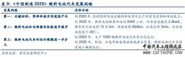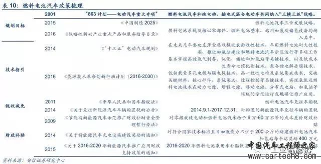 政策历来是国家推动新兴产业发展的指挥棒。我国政府对燃料电池汽车的发展规划早在2001年就已经启动,2001年的“863计划——电动汽车重大专项”项目,确定了“三纵三横”战略,其中“三纵”即包括纯电动、混合电动、燃料电池汽车。到2015年,《中国制造2025》规划纲要出台,提出了燃料电池汽车的三步发展战略,最终在2020年,达到生产1000辆燃料电池汽车并进行示范运行的目标。