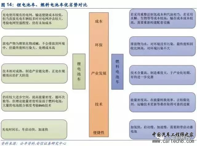 对比三种不同化石能源利用效率(内燃机为37%,燃料电池为45.7%,锂电池为49.2%),我们发现锂电池和燃料电池较传统燃油汽车都具有较大优势。当前锂电池车产业发展更为完善、积累的运行数据更多,但燃料电池车潜力巨大,两种路线并重更符合我国的国情。同时燃料电池作为锂电动车的增程手段不失为一种技术和商业上可行的过渡方案。