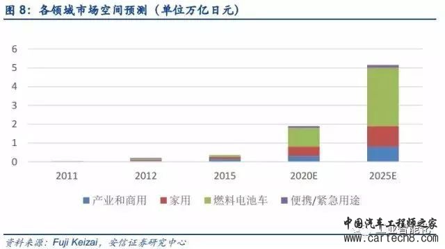 根据日本富士经济预测,至2025年,全球燃料电池市场有望达到5.2万亿日元(合约人民币3400亿元)。通过分析,我们发现2015年之前,燃料电池应用以产业和商业用途及家庭用途领域为主,但因燃料电池汽车商业化不断落地的催化,下游市场已出现结构性变化。2011年燃料电池汽车市场仅为3亿日元,未来随着技术升级、加氢站等基础设施的完善、政策支持力度加大,预计到2025年全球燃料电池汽车市场有望扩大到2.91万亿日元(合约人民币1900亿元),占整体市场一半以上,增长潜力巨大。