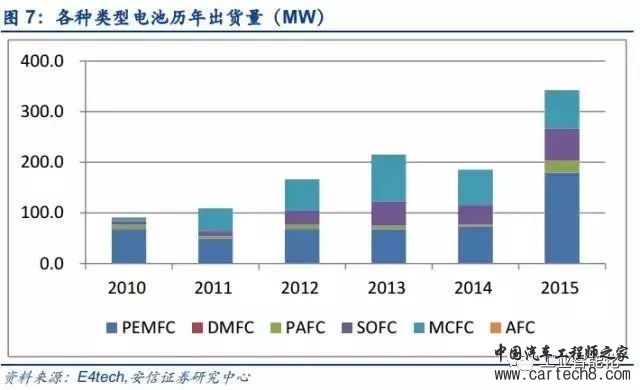 通过上文分析,可发现燃料电池应用主要集中在电站(含热电联产)、交通运输领域。事实上,早期燃料电池的应用主要集中在潜艇、航天等特殊领域,且技术已相对成熟。而在民用领域主要包括固定式领域、交通运输领域和便携式领域三大类,受益各国政策支持,汽车技术上取得较大突破,丰田、本田、现代等均推出了各自的量产燃料电池汽车,商业化进程正在加速。