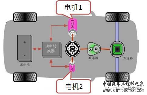 耦合驱动模式的构型如下图,双电机共用一个输出 ,可以等效为一个电机,所以也叫耦合驱动。这种构型的优点是能够有效的解决单电机设计矛盾 ,将一台电机分成两台电机,通过差异化互补,实现等效电机性能优化,是部件级解决方案。