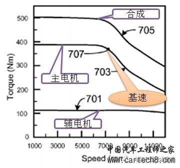 一大一小两类不同特性电机组合而成的高速性能,反而比两台同样大的电机组合更好。这是因为普通车用电机的弱点是:高速时由于电压约束,输出能力会明显下降。而恒转矩电机能以最少的成本,补偿普通电机的弱点,这叫差异化互补。 详见蜗牛的另一篇文章:电动汽车“双电机驱动”家族探秘