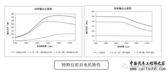 特斯拉工程师们还做了更深入的研究, 两台电机不仅仅是功率不一样,转矩转速特性曲线也不一样。如下图所示:主电机的是典型的横转矩横功率曲线,而辅电机的转矩却基本持平,可以认为是一个转矩源。这样做的目的是让两台电机实现差异化互补。