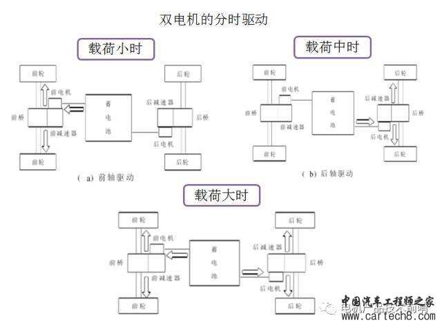 单电机系统的电动汽车,一般要求电机的总功率略小于电池电化学反应产生的输出功率,在电池容量不变的条件下,如果想提高动力性能,可以把电机峰值功率做的比电池略大一点,这样在加速和减速过程中, 电池的能力将完全发挥。但这样做带来的一个副作用,就是在正常工况下,电机的功率富裕了很多,出现了大马拉小车的现象,电机负荷都低, 效率就会下降, 续航里程也就下降。这就是单电机系统的死结,加速强则续航短,续航长则加速弱。