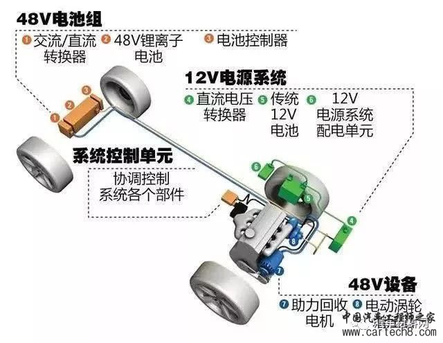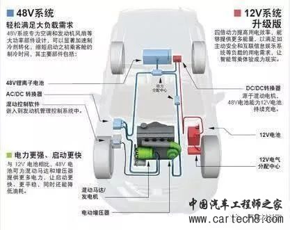 48V的核心技术在于:相比传统12V,由于电池电压输出的升高,降低了线路损耗,同时电压的升高也可以有效改善起停电机、空调压缩机、冷却水泵等系统的工作时间,让发动机在停车状态最大限度不参与工作;其次是48V的电压更能满足锂电池快速实现能量回收的要求,而回收的能量可用于辅助驱动等,降低发动机负载,从而实现了降油耗和排放的作用。