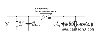48V系统并不是完全替代现有的12V架构。相反,这种方法不禁让我们能对12V系统进行拓展,以处理功率更高的负载,同时还能通过升降式转换器装置将48V系统耦合到这些系统中间。图1解释了这种架构的原理。常规的铅酸或铅酸胶体蓄电池用于12V等级,而锂离子电池则用于48V等级。双层电容器还可并联在此处,以在恢复过程中改善电能的存储状况。