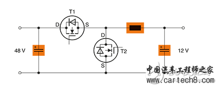 在集成的12/48V系统中,最重要的元件是升降式转换器,该转换器允许能量在两种不同的电压等级之间双向流动,并且能提供2~5kW的功率输出。图2显示了这种转换器的电路原理图。在正常模式下,该转换器作为降压转换器,将48V系统产生的功率输出到12V系统中。在此工作模式下,T2一直处于阻断状态,而T1则作为开关工作。如果需要输出48V等级电压,则必须采用升压模式。在这种情况下,T1一直处于接通状态,而T2则工作在脉冲模式下。为最大限度降低纹波电流和电压,实际运用中需要将6个或8个模块进行并联。