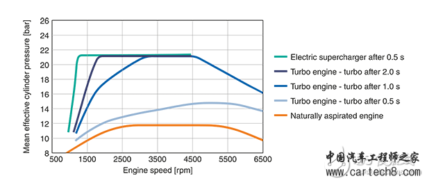 除泵机等常规电气化单元外,48V技术还通过电子涡轮增压器提高发动机的工作效率。常规的涡轮增压器主要通过消耗燃气进行驱动,因此它们的性能与发动机的转速密切相关。此外,它们在运行中还稍有延迟,我们将其称之为“涡轮迟滞”。该缺点可通过电动充电器予以消除,特别是当它们需要在较低的发动机转速下实现快速响应时,如市区行驶,从而提高发动机的效率(如图所示)。此外它还具有以下优势:电子涡轮增压器能与常规涡轮增压器相结合,进一步提高充电电压,或在发动机转速达到很高时关闭电动充电器。