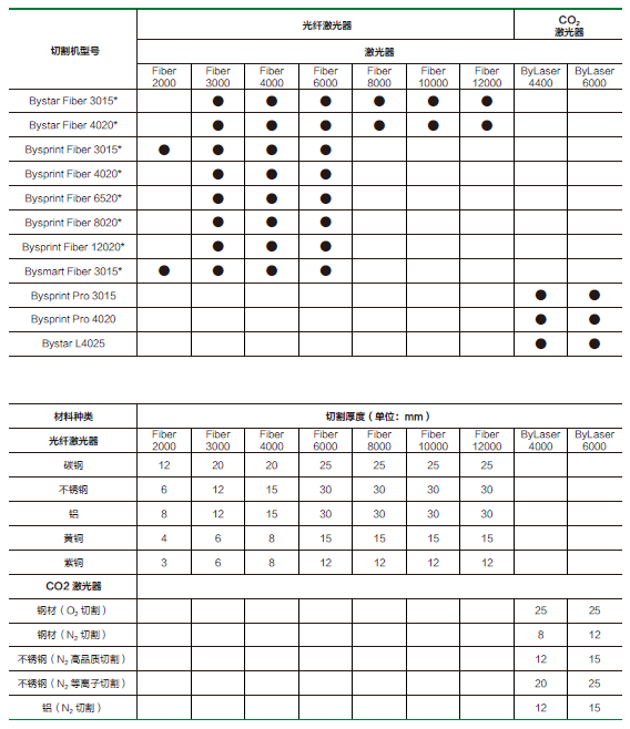 光纤激光器切割机:ByStarFiber、BySprintFiber和BySmartFiber系列和二氧化碳激光切割机:BySprintPro和BystarL系列,满足从0.8mm到30mm的不同材质的金属板材切割,包括高反光的黄铜和紫铜的切割。