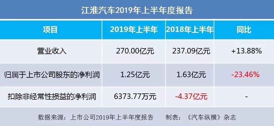 2019年8月27日,安徽江淮汽车集团股份有限公司发布了2019上半年度报告。报告显示, 2019上半年实现归属于上市公司股东的净利润为1.25亿元,同比下降23.46%。扣除非经常性损益(指扣除补贴等项目)后的净利润则为6373.77万元。