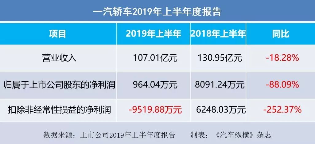 一汽轿车:2019上半年净利润964.04万元,下降88.09%