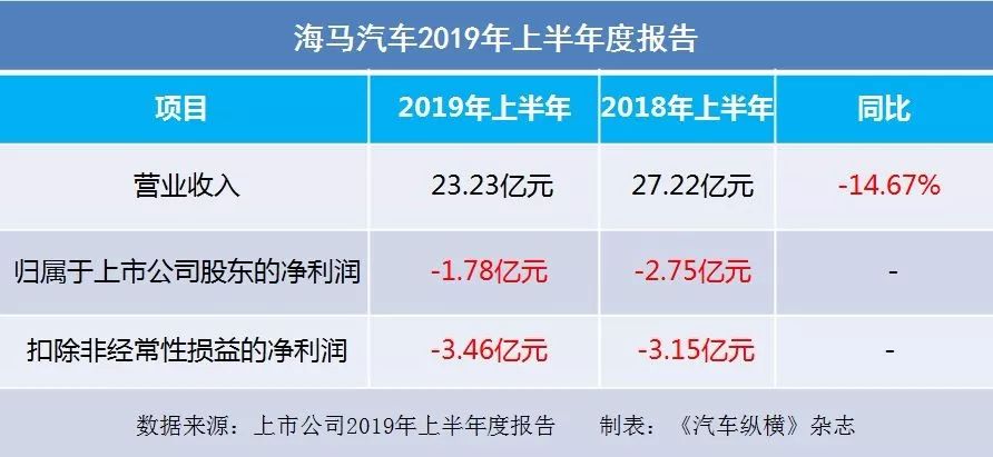 2019年8月24日,海马汽车股份有限公司发布了2019上半年度报告。报告显示,归属于上市公司股东的净利润亏损1.78亿元。扣除非经常性损益的净利润亏损3.46亿元。