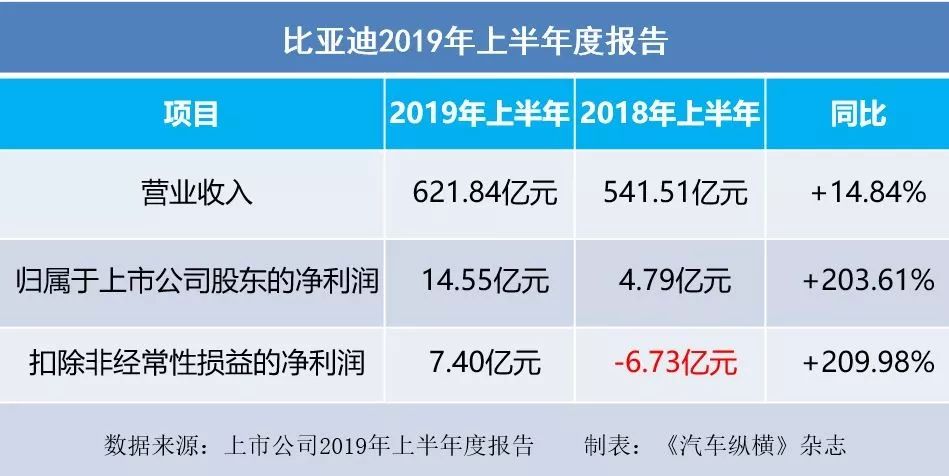 2019年8月22日,比亚迪股份有限公司发布了2019上半年度报告。报告显示, 2019上半年实现归属于上市公司股东的净利润为人民币14.55亿元,同比增长203.61%。扣除非经常性损益的净利润为7.40亿元,比上年同期增长209.98%。