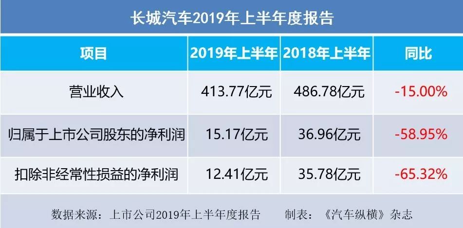 长城汽车:2019上半年净利润15.17亿元,下降58.95%