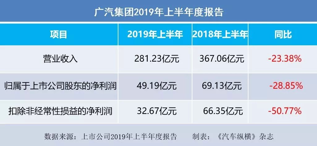 2019年8月31日,广州汽车集团股份有限公司发布了2019上半年度报告。报告显示,2019上半年实现归属于上市公司股东的净利润为49.19亿元,同比下降28.85%。扣除非经常性损益的净利润为32.67亿元,比上年同期下降50.77%。