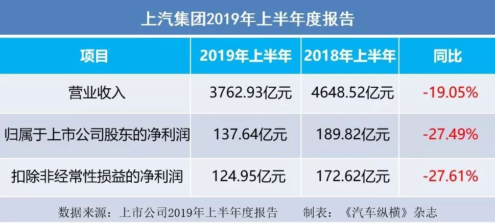 2019年8月29日,上海汽车集团股份有限公司发布了2019上半年度报告。报告显示, 2019上半年实现归属于上市公司股东的净利润为137.64亿元,同比下降27.49%。扣除非经常性损益的净利润为124.95亿元,比上年同期下降27.61%。