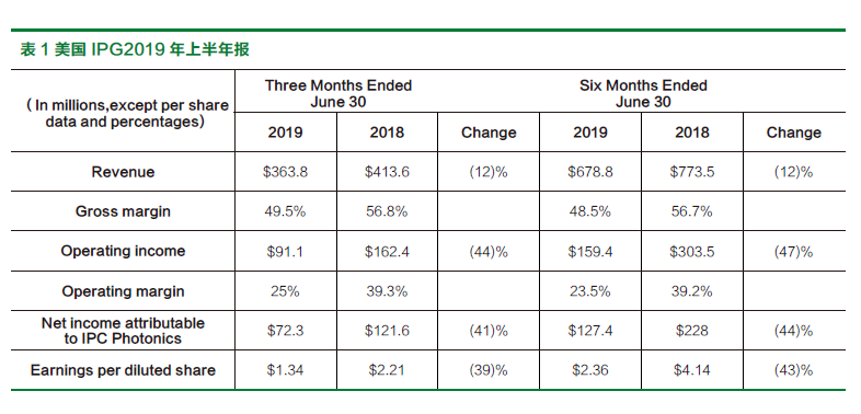 IPG 激光 2019 年第二季度收入 3.64 亿美元,同比下降 12%,净利润 为 7230 万美元,同比增加 -41%。