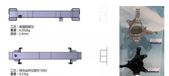 已经在吉利B级车博瑞(参数|图片)上采用铝合金前横梁,铝合金横梁相比高强钢滚压前横梁减重2~3kg,并且有更好的碰撞吸能效果,铝合金转向节也正用于博瑞换代车型上,减重60%,降低簧下质量,提高整车操稳性。根据规划铝合金技术后续还将用于更多车身和底盘件上。