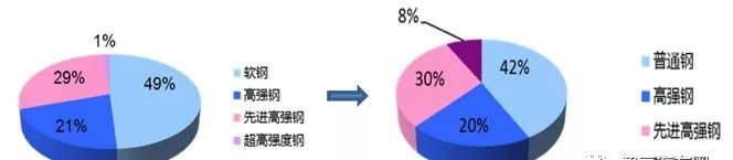 高强钢已经在吉利车型上大量应用,如博瑞相比吉利老款车型,普通钢应用从49%下降到42%,其中热成型钢应用比例高达8%。