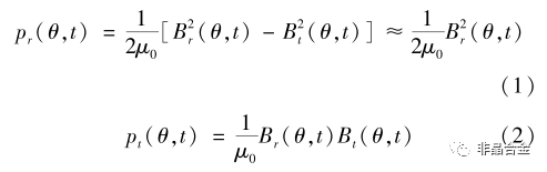 电机内部气隙处各阶磁场相互作用,在定子齿部表面形成垂直于切面的径向电磁力波和平行于切面的切向电磁力波。径向电磁力波产生电磁振动,切向电磁力波形成电磁转矩作用于定子齿部。电机内部电磁场的分布确定之后,根据Maxwell 张力公式,定子齿端表面的电磁力密度可以表示为: