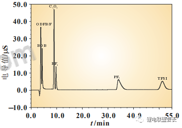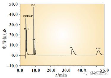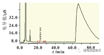 CF3SO3-在色谱柱中保留能力弱,因此出峰时间早,但要注意F离子峰与其相隔很近,必须配制合适的淋洗液体系,要确保两峰能分离开来,F离子基本上都是电解液中锂盐水解产生的。