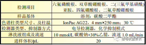 LiFSI、LiBF4热稳定性好,对水不敏感,不易水解,而LiBOB水解缓慢,采用离子色谱法分析时,在出峰后未发生水解,因此可以采用离子色谱直接电导法进行测试分析。此三种锂盐一般作为电解液中锂盐添加剂,与主盐(LiPF6)混合测试无干扰。