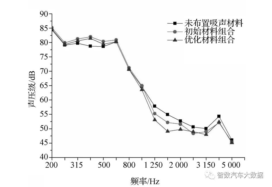 驾驶员耳旁声压级频谱曲线对比如图16所示。由图可见,在200~500Hz频段,初始材料组合与优化后的材料组合声压级都超出了未安放吸声材料时的声压级,但优化后的材料组合的声压级小于初始材料组合的声压级;在500~1 000Hz频段,3种情况的声压级差别不大;1 000Hz以后,优化前后的材料组合的声压级均比未安放吸声材料有较大幅度的降低,优化后的材料组合的降噪效果更为明显。