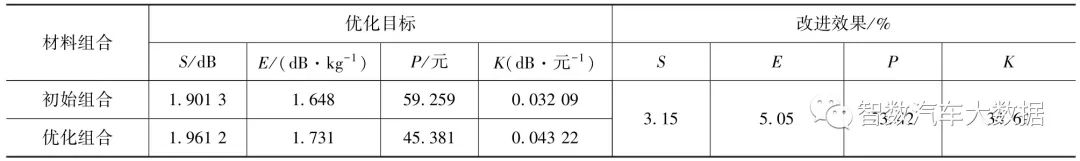 各优化目标所取权重会影响优化结果。在第3.1节所取得权重条件下,优化效果如表5所示。与初始材料组合相比,优化后的材料组合降噪幅度提高3.15%,降噪效率提升5.05%,材料成本降低23.42%,而性价比提高34.69%。