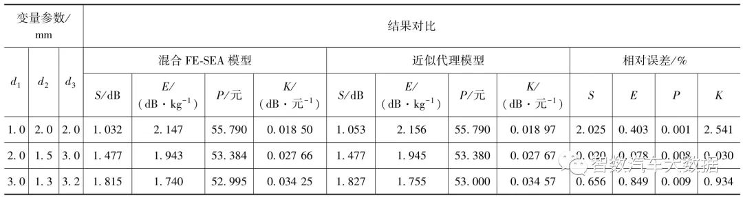 基于表2中优化目标与设计变量之间的响应性关系,选取设计空间范围中除设计方案以外的任意3组样本点,进行FE-SEA计算,最后将得出的计算结果同近似模型的结果进行对比,以此来验证近似模型的精度,如表3所示。