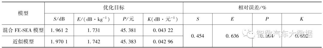 根据建立的近似模型,采用NSGA-Ⅱ算法进行寻优,最终得到近似模型最优样本点组合(d1,d2,d3,d4)为(3.1,2.2,4.0,0.7),对最优材料组合下的优化指标进行混合FE-SEA仿真,其结果与采用近似模型获得的结果之间的误差在1%之内,如表4所示。