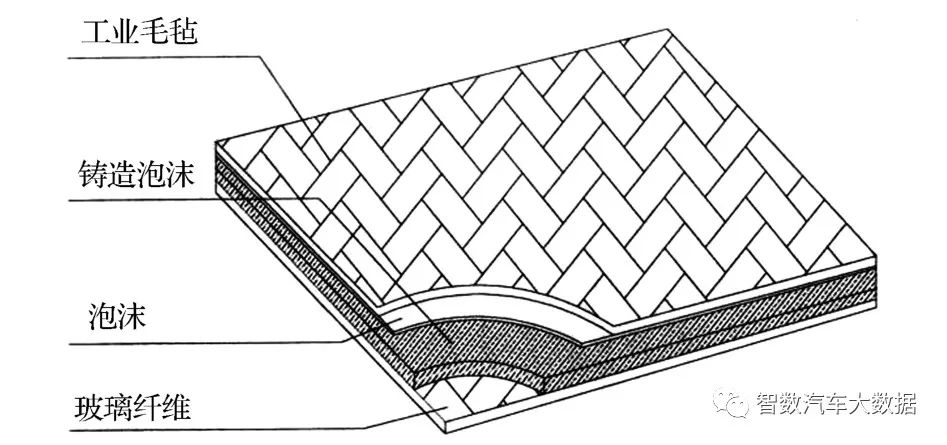 在确定乘员室声腔主要声学包参数的基础上,选取汽车工业中较为常见的4种内饰吸声材料:工业毛毡、泡沫、铸造泡沫和玻璃纤维,材料参数如表1所示。将4种材料安放于顶棚和左右侧围,叠放方式如图15所示。