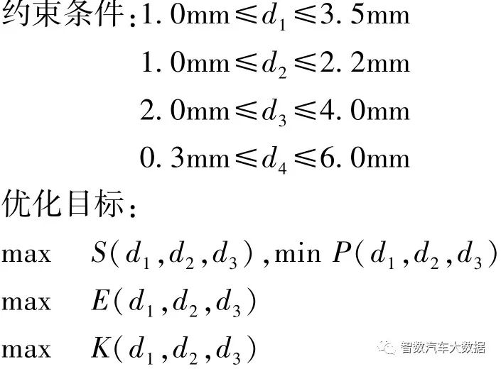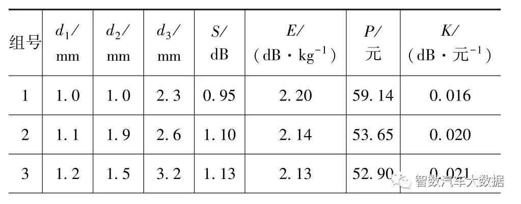 根据汽车生产商和消费者对优化目标要求的侧重程度有所不同,S,E,P和K的权重系数分别取0.2,0.3,0.1和 0.2。因为设定了总材料厚度为10mm,所以在下文相关列表中仅列出了d1,d2和d3的有关数据。