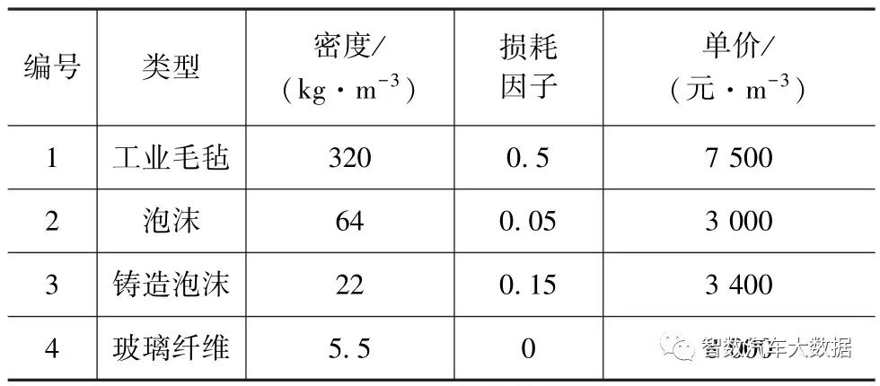 选取各层材料厚度为设计变量,分别为工业毛毡厚度d1、泡沬厚度d2、铸造泡沬厚度d3和玻璃纤维厚度d4。各设计参数的取值范围为:d1∈[1.0,3.5],d2∈[1.0,2.2],d3∈[2.0,4.0],d4∈[0.3,6.0]。且为确保乘员室声腔的空间内外尺寸不受较大程度的影响,要求各层材料厚度之和为10mm。