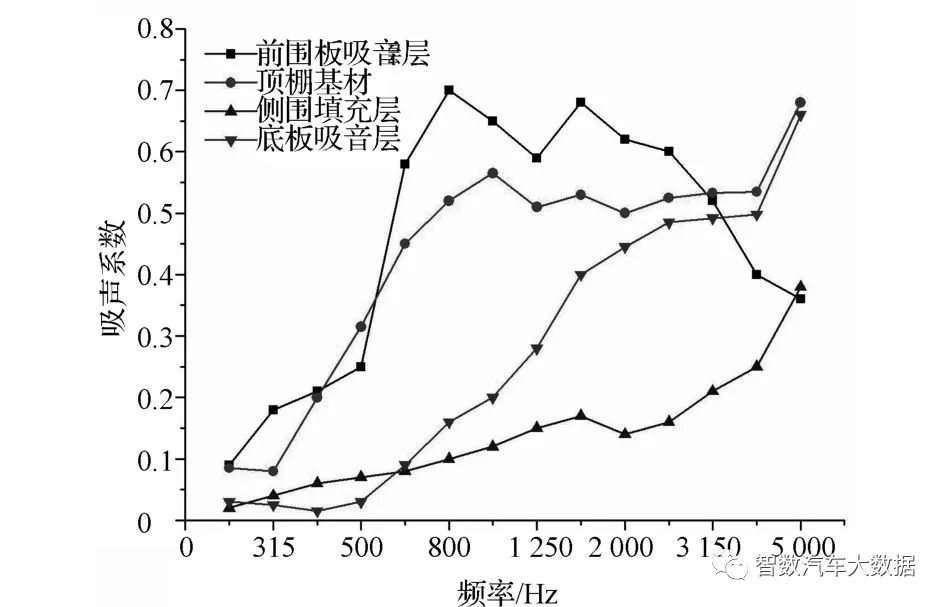 在整车开发过程的仿真中,通常对车辆进行声学简化处理,并根据用户对该样车总体噪声水平的期望目标,设计声学包配置方案,其中乘员室声腔主要结构板件的吸声系数的测试现场和测试结果分别如图13和图14所示。