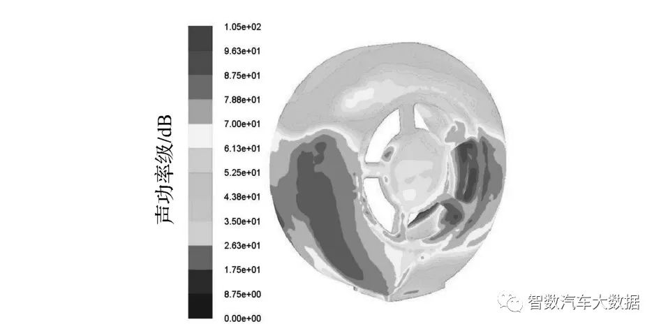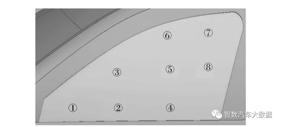 依据混合FE-SEA方法对声源输入信号的条件要求,将车身表面结构子系统的脉动压力转化为平稳均匀的声压频谱,并将其作为计算模型的激励输入。在进行流体动力学计算前,先对流体计算域划分网格,车身周围网格分布如图3所示,为保证后续环节拥有较高的计算精度,在流体动力学稳态计算结束后,以车身表面的等静压云图(见图4)的疏密分布情况为参考,在各子系统表面选取若干个监测点:在静压较强的区域,适当增加监测点数量;在静压较弱和变化较为缓和的区域可适当减少监测点数量,左前侧窗监测点如图5所示。在进行风速为30m/s时的瞬态LES计算时,启用FW-H声方程,计算得到各监测点的脉动压力谱,然后通过FFT变换和对数转换,最终获得左前侧窗系统平均偶极子声压谱,如图6所示,同时可获得前风窗、后侧窗和门板等结构子系统的平均声压谱,并将其作为激励施加至FE-SEA模型,其中FE子系统上载荷施加方式如图7所示。