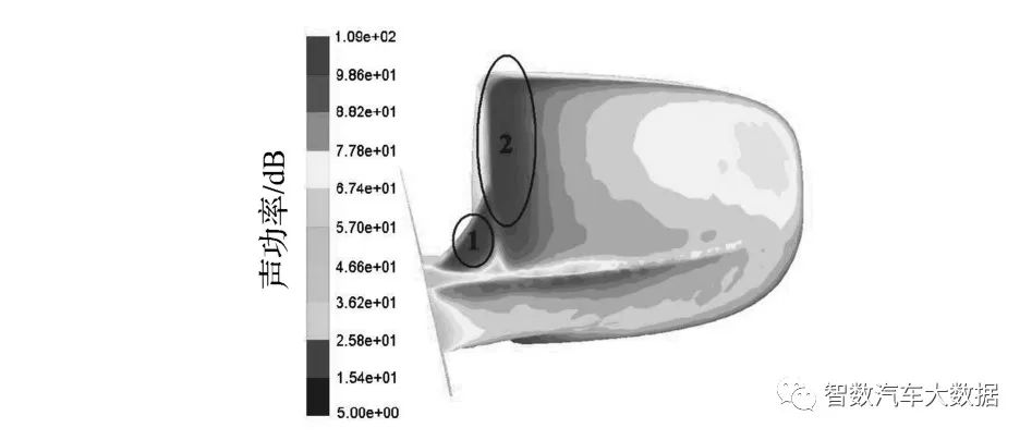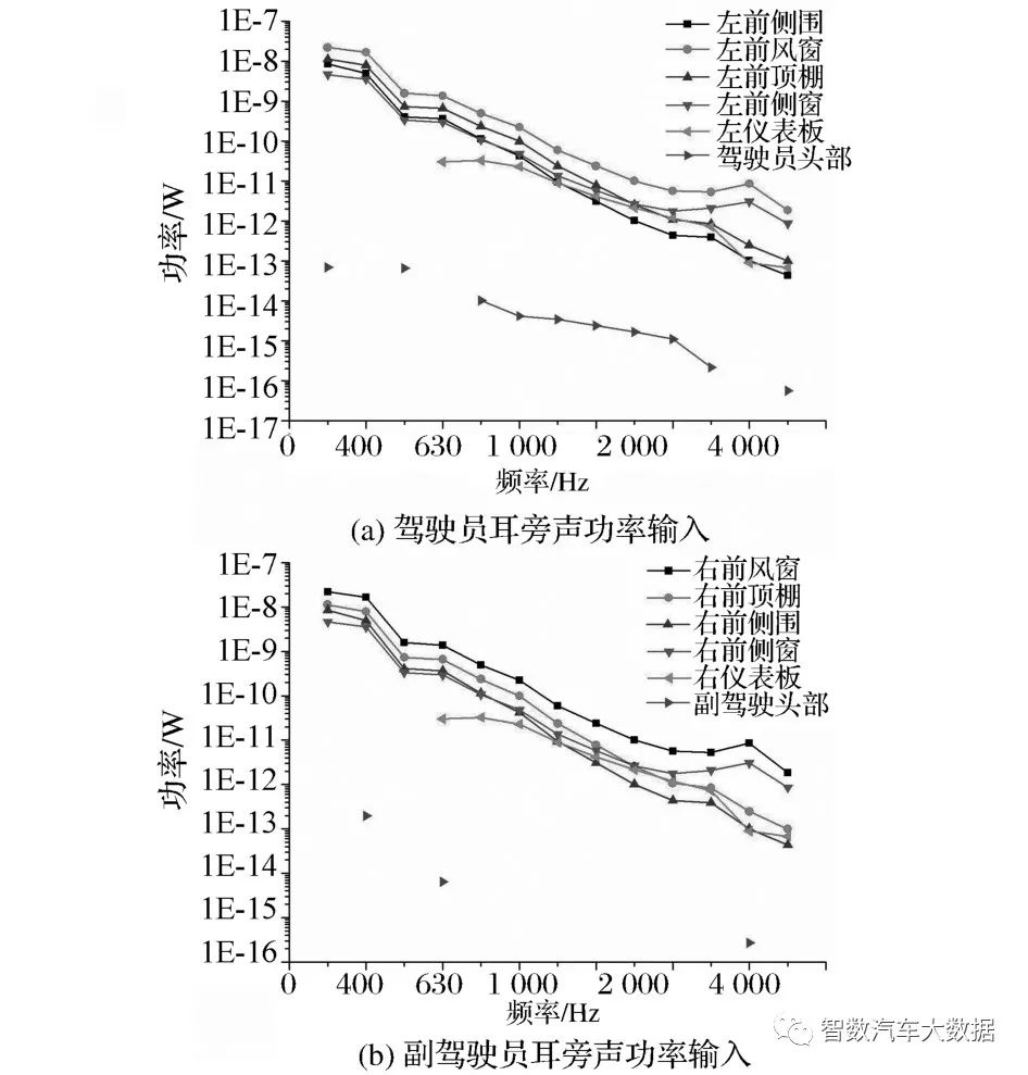 汽车车身表面各部件的偶极子分布情况对乘员室内部声腔的噪声贡献有直接影响,如图10和图11所示,其中后视镜区域1与2处曲率较大,引起气流分离,导致压力脉动变化剧烈,因此声功率级较高。在气动噪声计算与控制过程中,通常关注的是乘员耳旁的噪声水平,因此以驾驶员与副驾驶耳旁的声功率输入大小作为噪声贡献量的评价指标,结果如图12所示。经分析可发现,由于风窗玻璃的刚度较低,隔声效果较差,前风窗和左右侧窗是最大的声功率输入子系统,顶棚和左右侧围次之,而仪表板在中高频区域对输入功率也有明显的影响。因此在进行乘员室声学优化时,须在左右侧窗、前风窗、顶棚和左右侧围安放吸声材料。在实际工程应用中,在侧窗和前风窗上安放吸声材料较为困难,因此,仅在左右侧围和顶棚安放吸声材料。
