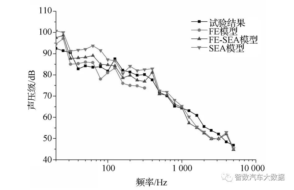 为了验证混合方法的可靠性与准确性,采取传统FE和SEA计算方法与其进行比较,结果如图9所示。由图可见:在20~200Hz低频区,FE模型计算结果与试验结果较好吻合,能准确捕捉到响应峰值;SEA模型在20~200Hz低频区与试验结果对比误差较大,最大达10dB,精度较差,但是在500Hz以后的高频区能与试验结果较好吻合;FE-SEA模型在20~100Hz低频区能捕捉到响应峰值,但与试验结果有些差距,计算精度也低于FE模型,从100Hz开始其计算精度逐渐提高,特别是在200~500Hz的中频区域,FE-SEA模型计算精度比其它两种方法都高;在满足各结构模态数的理论假设条件下,500Hz以后的高频区计算结果与试验结果较为一致。