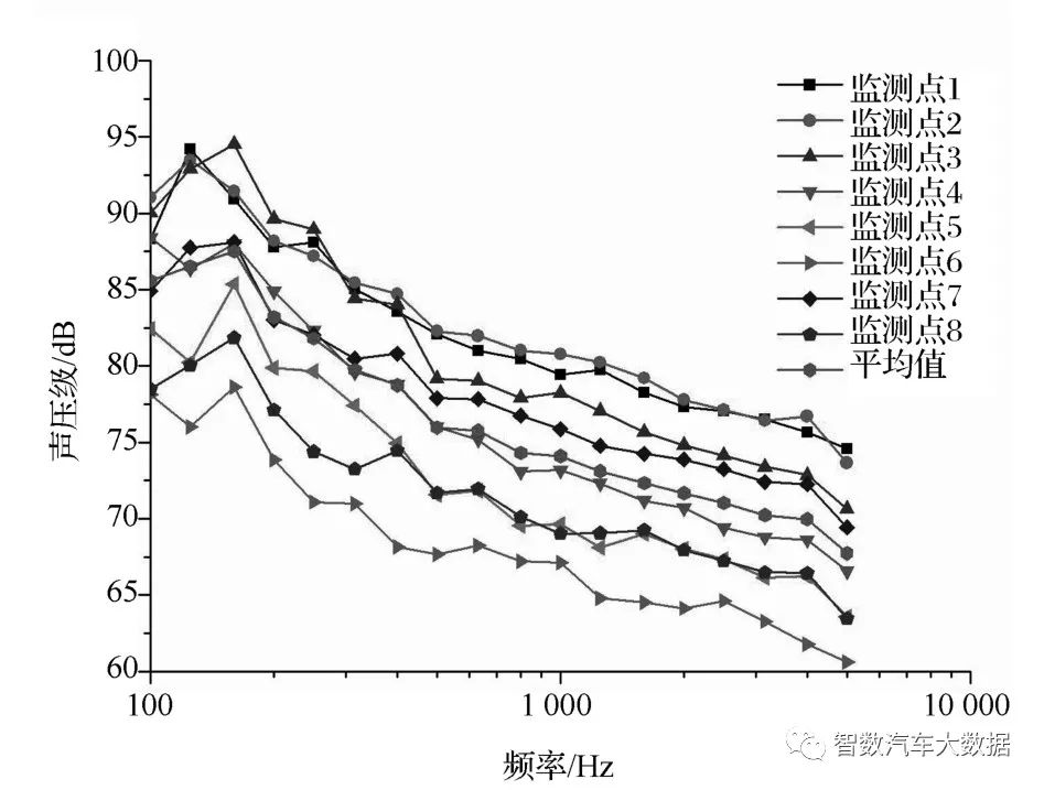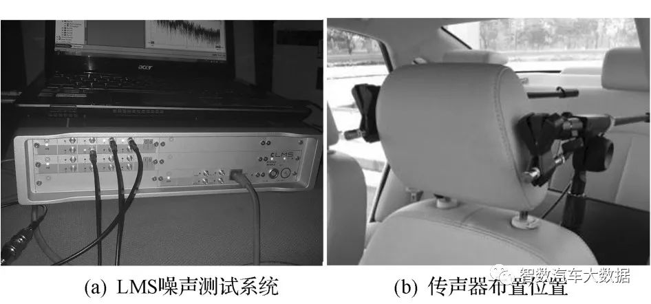 依据车内噪声道路测试标准规定,测量跑道选择具有足够长度的清洁、干燥、较为光滑、平坦(纵向坡度在0.1%以内)的某沥青高速公路。气象条件要求为无雨、无雾、风速不大于5.6m/s的晴朗天气,为将外界干扰降到最低,选择试验时间段为某日凌晨3-4点,同时,为减少发动机噪声对试验结果的影响,在汽车加速至108km/h时,将汽车发动机关闭,脱挡滑行,利用LMSTest.Lab噪声测试仪器采集试验数据。此过程重复3次,取平均值,传声器的布置严格依据GB/T 25982—2010,如图8所示。