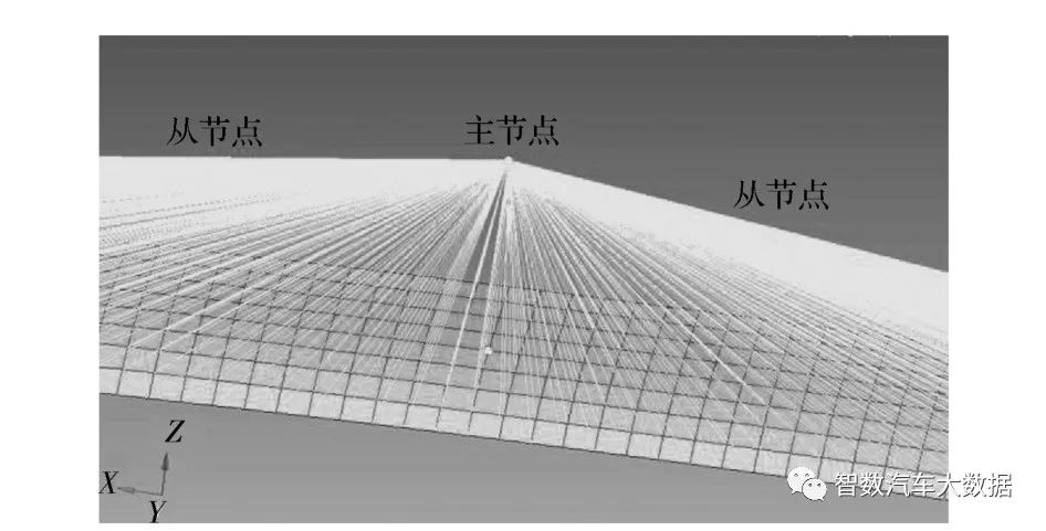 本文中以某轿车为研究对象,根据子系统带宽Δf内的振型数可对频率范围进行划分:当N≤1时,定义为低频区;当1<N<5时,为中频区;当N≥5时,为高频区。依据模态相似原则划分车身表面结构子系统,以保证SEA子系统拥有满足统计能量分析需求的较高模态密度(分析带宽内的模态数不低于5),同时FE子系统在分析带宽内的模态数不高于5。根据以上原则,整车FE-SEA混合模型共划分为162个子系统,其中SEA平板子系统106个,SEA曲面板子系统14个,SEA声腔系统6个,FE子系统36个。各子系统通过点线面耦合连接,形成一个整体,最终实现各个相应结构之间的能量正常流动,其中乘员室声腔模型和FE-SEA车身表面连接模型分别如图1和图2所示。